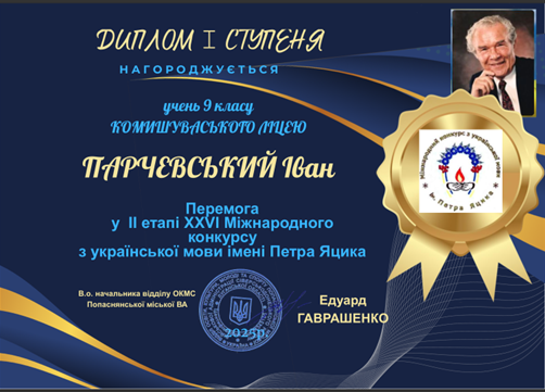 ВІТАЄМО !!!! Диплом І ступеня - Парчевський Іван, КОМУНАЛЬНА УСТАНОВА "КОМИШУВАСЬКИЙ ЛІЦЕЙ" ПОПАСНЯНСЬКОЇ МІСЬКОЇ ТЕРИТОРІАЛЬНОЇ ГРОМАДИ ЛУГАНСЬКОЇ ОБЛАСТІ