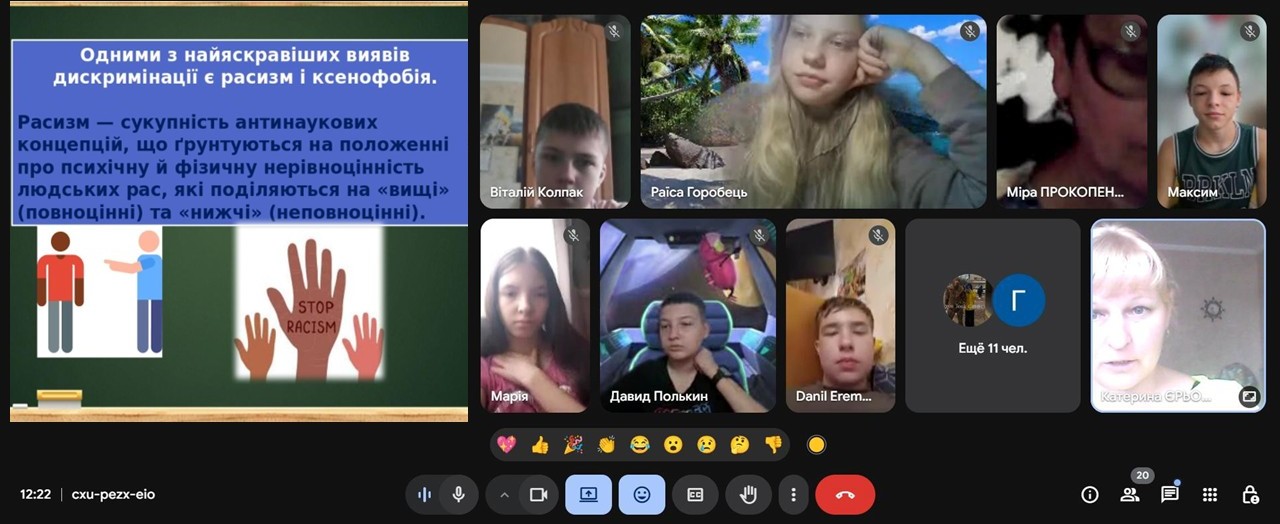 Онлайн-захід «Запобігання дискримінації в освітньому середовищі» проведено у дистанційному форматі з учнями 6–11 класів. Під час заходу обговорювалися прояви дискримінації, расизму та ксенофобії, важливість поваги до прав національних меншин, зокрема ромської національної меншини, формування толерантного та безпечного освітнього середовища.
